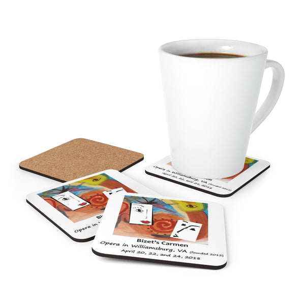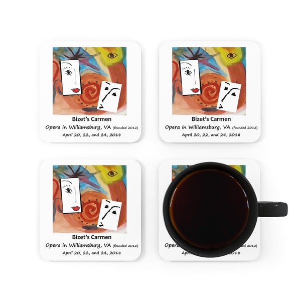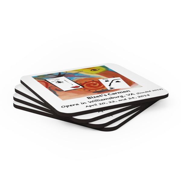 Crafted with genuine cork bottoms, these coasters are built to last. They’re all topped with polyester-coated hardboard. Made in America, these items come in a 3.75″ X 3.75 square shaping. The artwork on this poster was designed by Opera in Williamsburg, Virginia's Artistic and General Director Naama Zahavi-Ely for the opera Carmen by Bizet, which was performed at the Kimball Theatre in Williamsburg, Virginia, on April 20, 22, and 24, 2018. For each coaster sold, $5 will support Opera in Williamsburg, Virginia.