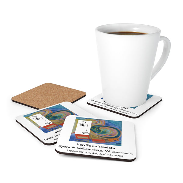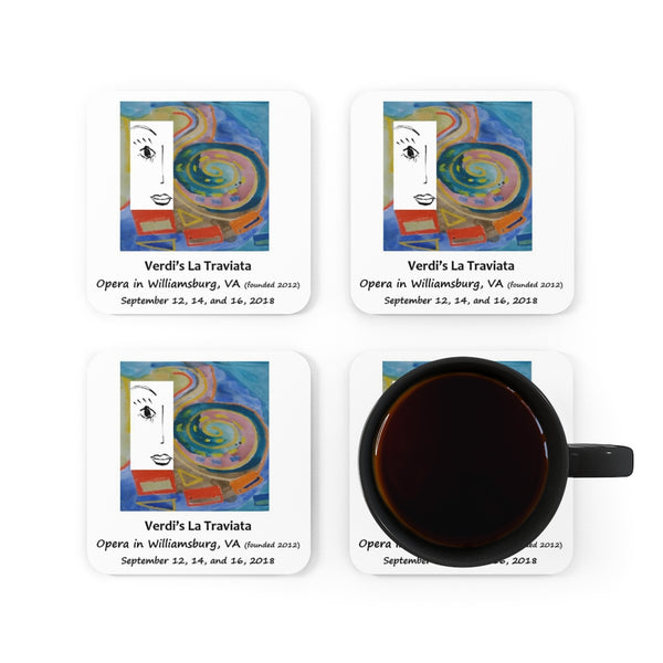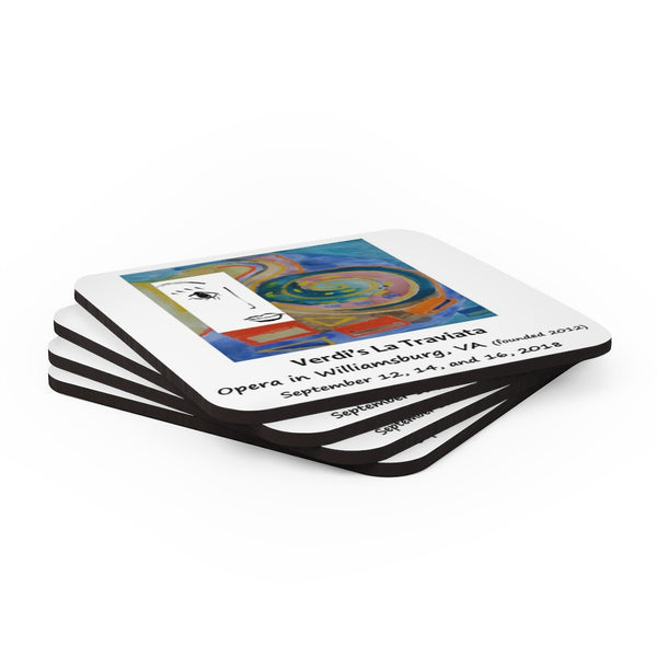 Crafted with genuine cork bottoms, these coasters are built to last. They’re all topped with polyester-coated hardboard. Made in America, these items come in a 3.75″ X 3.75 square shaping. The artwork on this poster was designed by Opera in Williamsburg, Virginia's Artistic and General Director Naama Zahavi-Ely for the opera La Traviata by Verdi, which was performed at the Kimball Theatre in Williamsburg, Virginia, on September 12, 14, and 16, 2018. For each coaster sold, $5 will support Opera in Williamsburg, Virginia.
